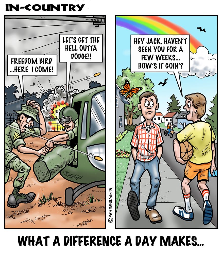 Phil enlisted in the Army in 1965 where he served for years in Vietnam. He became a graphic designer and has worked for the state of Oregon for 26 years. He retired in 2003 and started the Cartoon "In-Country". The cartoons reflect his experiences during his tour of duty in South Vietnam.